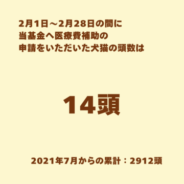 2026年2月1日~2月28日までに、医療費補助の申請のあった保護犬猫の頭数は、14頭でした。