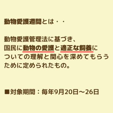 動物愛護週間とは、動物愛護管理法に基づき、国民に動物の愛護と適正な飼養についての理解と関心を深めてもらうために定められたものです。
