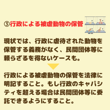 ➡だからこそ、行政による被虐動物の保管を法律に明記すること。もし行政のキャパシティを超える場合は民間団体等に委託できるようにすること。