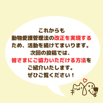 今秋開催が予定される臨時国会において、さまざまな重要課題が取り上げられるであろう中、その中に動物愛護管理法の改正も加えてもらうためには、皆さまの声が欠かせません。この声が社会を動かす力となるよう、さらに強く発信していくために、皆さまのお力添えが何よりも重要です。