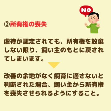 ➡だからこそ、改善の余地がなく飼育に適さないと判断された場合、飼い主から所有権を喪失させられるようにすること。