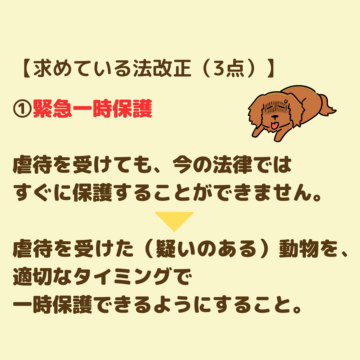 ➡だからこそ、虐待を受けた(疑いのある)動物を、適切なタイミングで一時保護できるようにすること。